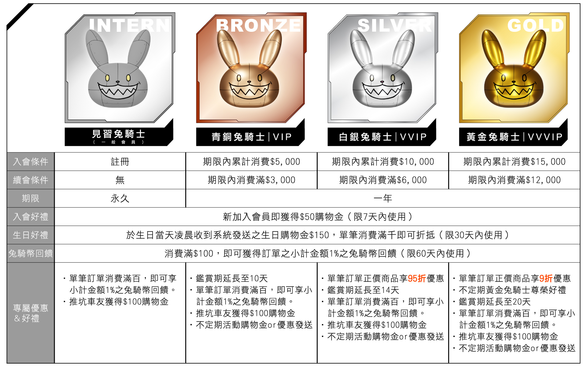 ➪一年內累積消費滿NT$5,000即可升級為白銀兔騎士,會員資格有效期限為一年,於期限內累積消費金額NT$3,000即符合續會資格。